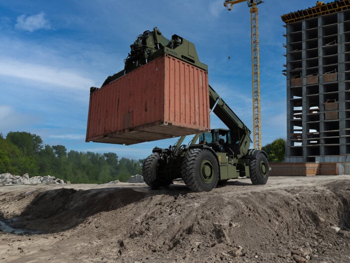The Rough Terrain Container Handler (RTCH) is a purpose-built solution engineered for the world’s most demanding environments. Designed to perform where conventional equipment cannot operate, the RTCH combines strength, versatility, and mobility to handle containers and cargo in areas without established infrastructure, for example in defence applications, mining and resource exploration.